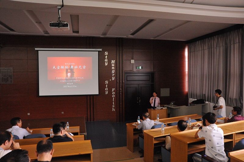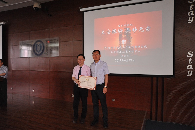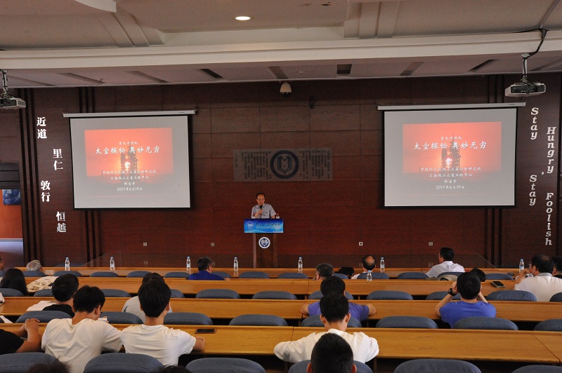 聘任仪式结束后,林宝军研究员向在场师生做了一场题为“神舟问天奥妙无穷”的报告。报告从全世界的航天之路、中国空间技术发展、载人航天工程发展、微小卫星的发展和北斗卫星的研制等几个方面的内容,重点介绍了神舟飞船和北斗卫星的创新研发历程,通过数据、图片和视频展示了中国科技工作者在空间开发领域上发挥的开拓精神和获得的骄人成果。
