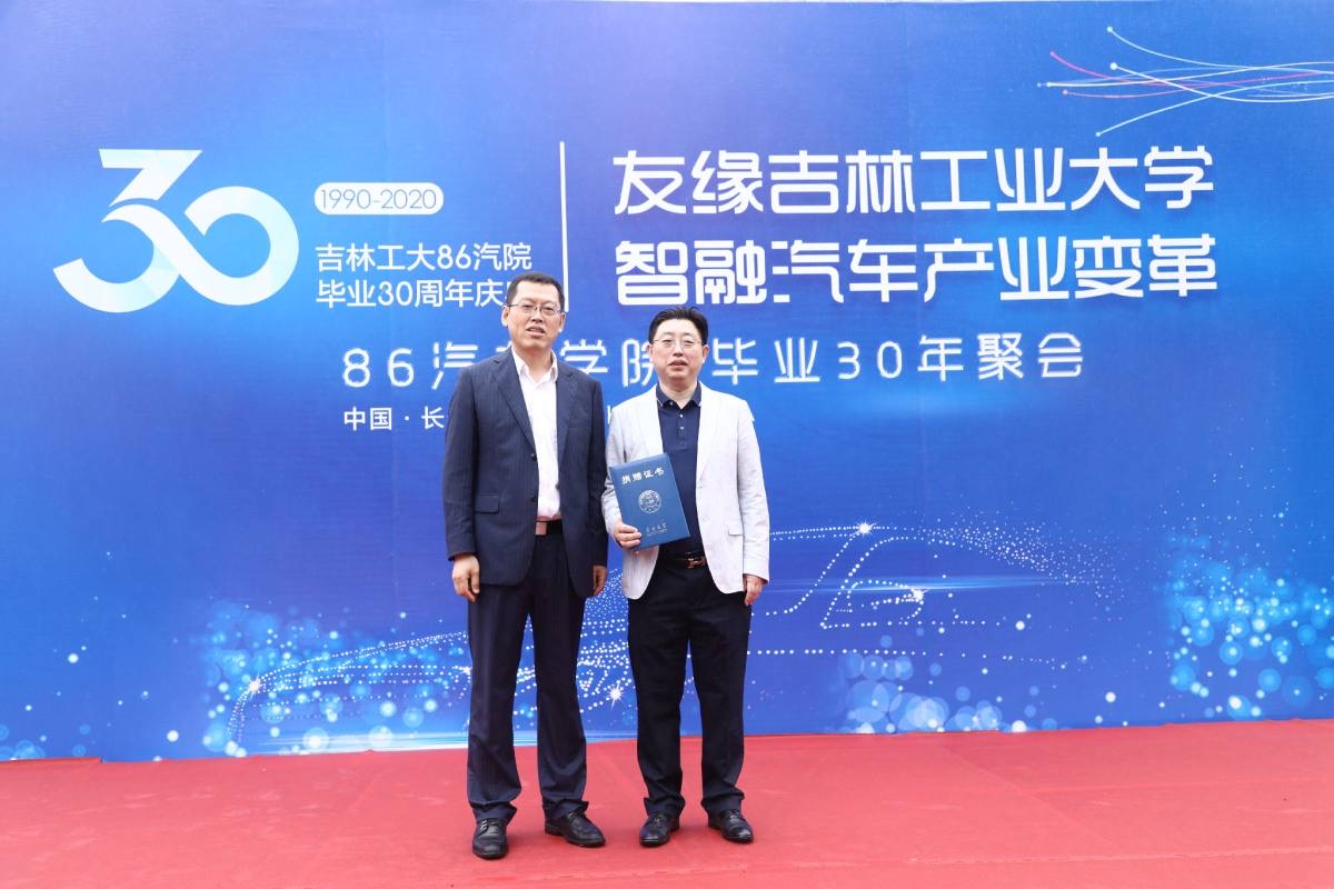 李善兴书记代表学院接受86级校友捐赠,并向86级校友代表、深圳奇建汽车贸易集团有限公司董事长房立新颁发了捐赠证书表示感谢。
