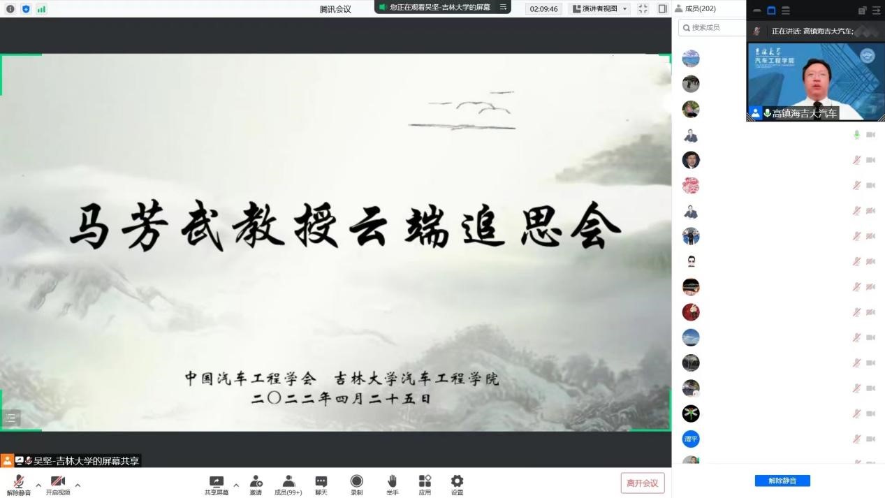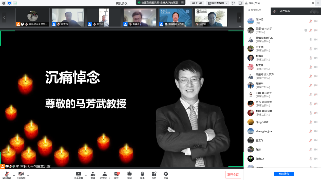 2022年4月21日,FISITA技术领导力会士、SAE International会士、中国汽车工程学会会士、《Automotive Innovation》执行主编、pp电子游戏平台网站工程学院马芳武教授因病在长春逝世。为在疫情期间做好马芳武教授的悼念活动,4月25日,中国汽车工程学会、pp电子游戏平台网站在腾讯会议平台联合举办云端追思会。来自pp电子游戏平台网站、汽车行业学会、企事业单位、海内外校友代表,以及马芳武教授的亲朋、同事、同学、学生等近四百人共同缅怀追思。会议由pp电子游戏平台网站院长、汽车仿真与控制国家重点实验室主任高振海主持。