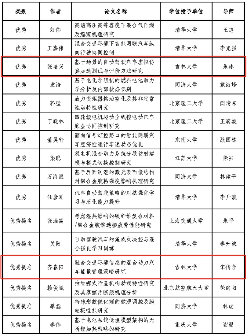 pp电子游戏平台网站朱冰教授指导的张培兴博士毕业论文《基于场景的自动驾驶汽车虚拟仿真加速测试与评价方法研究》荣获“优秀博士学位论文”,宋传学教授指导的齐春阳博士毕业论文《融合交通环境信息的混合动力汽车能量管理策略研究》荣获“优秀博士学位论文提名”。