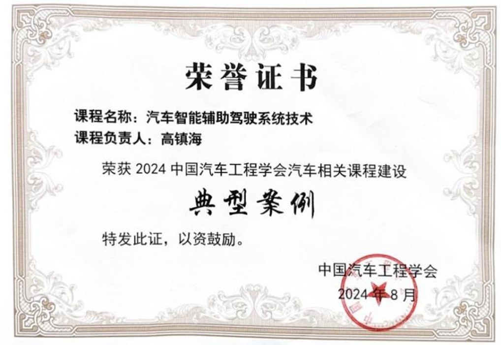2024年8月,pp电子游戏平台网站高镇海教授、胡宏宇教授、孙天骏副教授联合开设的“汽车智能辅助驾驶系统技术”课程荣获2024中国汽车工程学会汽车相关课程建设典型案例奖。该奖项是由中国汽车工程学会于2023年首次设立,面向全国高等院校进行汽车相关课程建设案例征集,并将优秀典型案例在全国汽车行业人才培养院长论坛上进行现场展示。