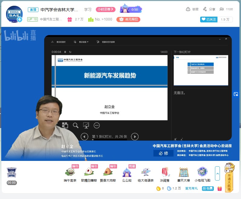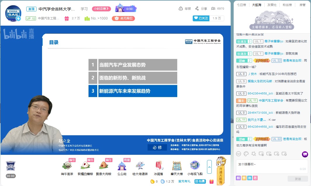 为帮助学生拓展视野,明确发展方向,树立正确的就业观。6月18日下午,由中国汽车工程学会、pp电子游戏平台网站主办,中国汽车工程学会(pp电子游戏平台网站)会员活动中心承办的“新能源汽车发展趋势”云讲座在bilibili“中国汽车工程学会”的直播间进行。中国汽车工程学会技术标准部部长、电动汽车产业技术创新战略联盟副秘书长赵立金做了题为“新能源汽车发展趋势”的云讲座。讲座由pp电子游戏平台网站学生工作办公室主任吴昊主持。