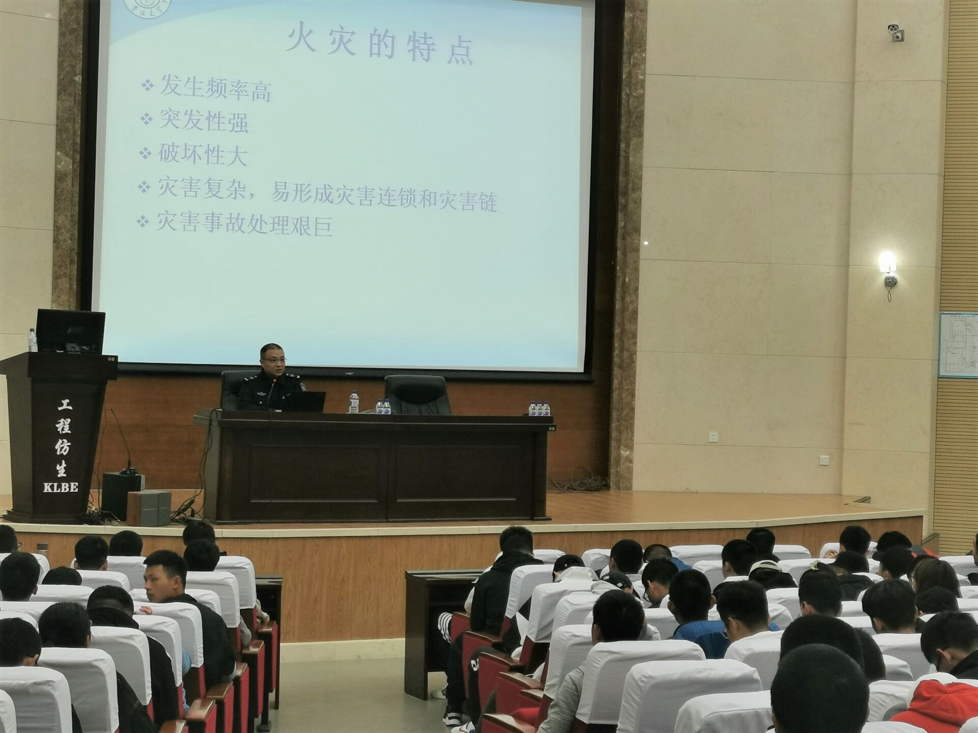 上午十点,2020级汽院新生在仿生楼报告厅就坐,安静等待聆听老师的发言。主讲人韩旭老师以防火消防为主题,结合PPT,图文并茂,并列举生活中的实例和过去的火灾新闻,告诉同学们防火意识的重要性和校园生活中应当注意的事项。讲座内容注重防火意识宣传及寝室中违禁物品的介绍,并强调禁止使用违章电器,为新同学敲响警钟,把好寝室防火第一关。